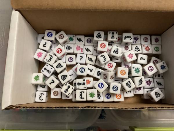 MY HUSBAND USED TO PLAY DICE MASTERS. HE NO LONGER PLAYS. SELLING THIS AS A LOT, WILL NOT SELL SEPARATELY. MY HUSBAND MADE THE CASE. IT HAS A SLIDING TOP, AND FOAM TO HOLD THE DICE AND CARDS IN PLACE. THERE ARE CARDS IN ALL THE BINDERS. WOULD LIKE TO GET THIS SOLD ASAP.