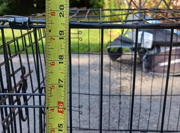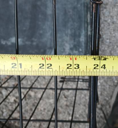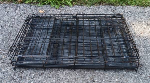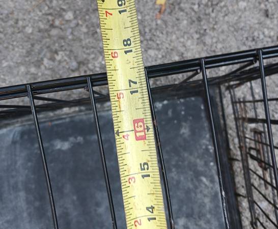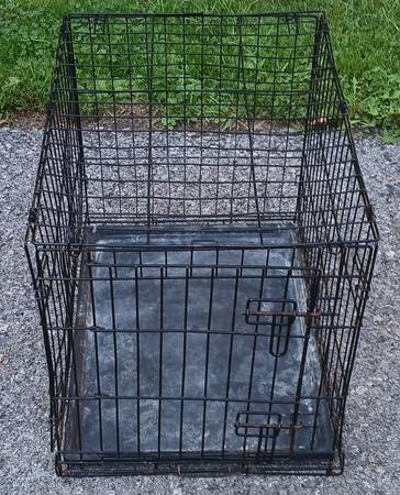 Black metal pet crate with pull-out plastic tray. Has a some dents & dings and a little rust but secure, fully functional and fairly clean. 24" x 17 1/2" x 20" high folds up for storage and transport. $15