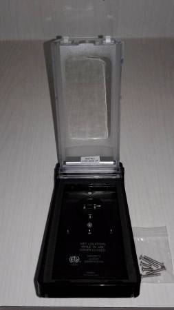 Watkins weather resistant GFCI receptacle cover with plug-in outlet-PN:39453. Flip cover, rain tight seal, 20A/115V, measures: 3.5" x 7.25". New, unused, in original box, installation instructions...