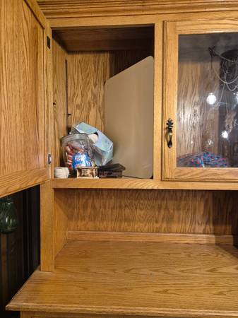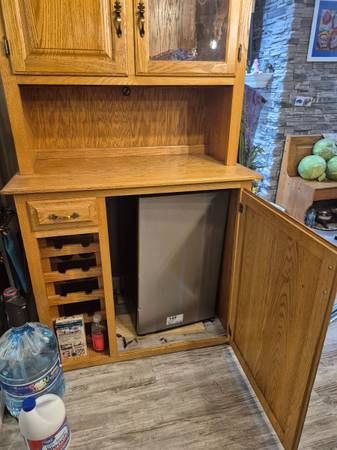 Custom made, Amish, cabinet. Has under cabinet fridge. Glass top for glasses, and solid door for liquor. Also has rack for wine bottles.