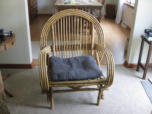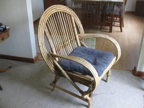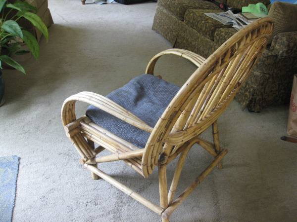 Rattan chair with removable cushion, very sturdy and comfortable.not used in 20 years, like new. 37 inch tall 30 inch wide.$40, if listed,is still available.