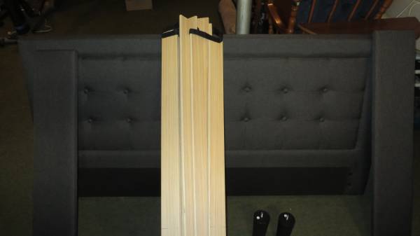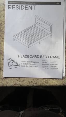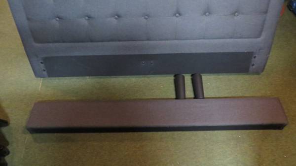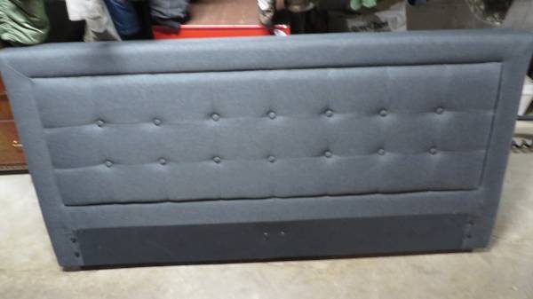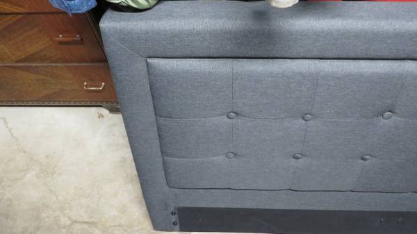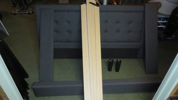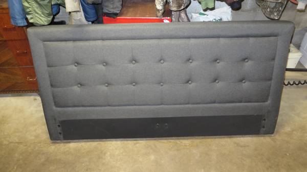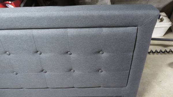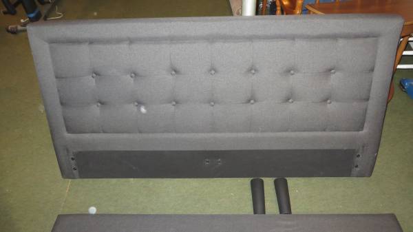 A queen memory foam complete headboard and frame. The headboard, footboard and sideboards are upholstered charcoal gray. Multi slat hardwood support rails. Strong black metal underframe. Easy assembly. Headboard is 67" long x 32" high. The frame sits on 8" legs. Bought brand new 2/25 sold by Nectar Memory Foam Mattress Company. Excellent like new condition. This is the proper support frame for all queen size memory foam mattresses.