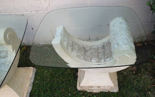 1980S TESSELLATED STONE ORGANIC SHAPE BASE END TABLE SET 2 IDENTICAL - $45.00 Vintage 1980s Tessellated Mactan Stone Table in the Style of Maitland Smith REMOVABLE GLASS TOP MEASURES 28” x 24” TABLE...