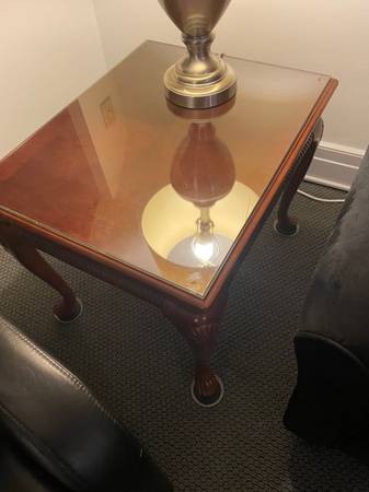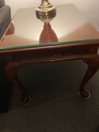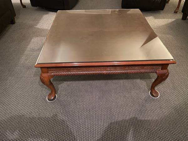 Coffee table (37.5” x 37.5” x 16”H) and two end tables (27.5” x 22” x 22”H). All three have been covered with glass to protect the table tops. Glass included.