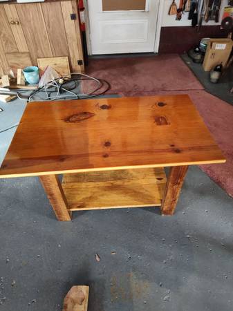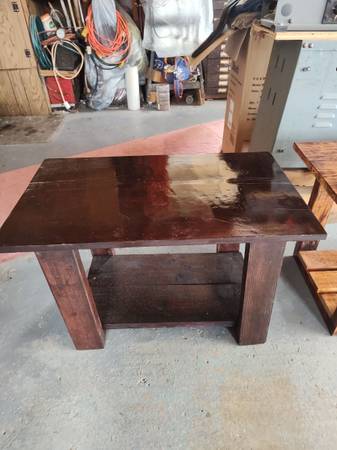 Coffee table mahogany top finished with multiple coats of polyurethane and has ruff cut bottom shelf. Measures 29"lx17"wx18"h $70.00 bo. If you see this add it's available.
