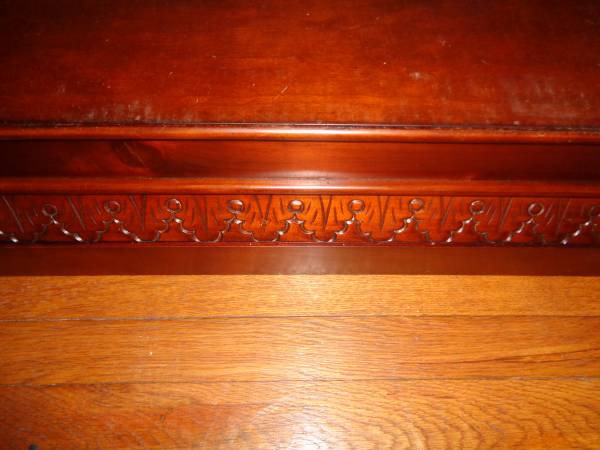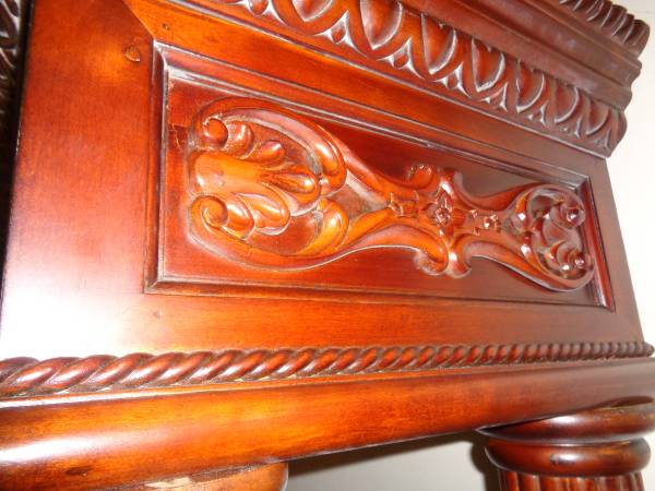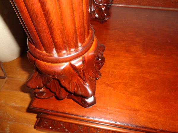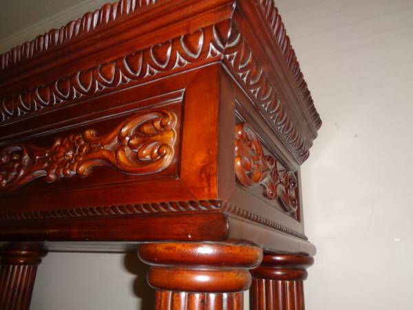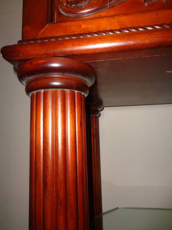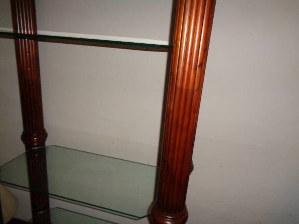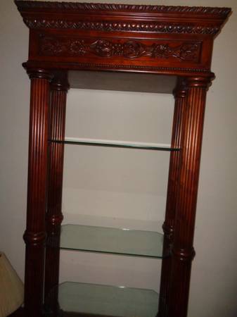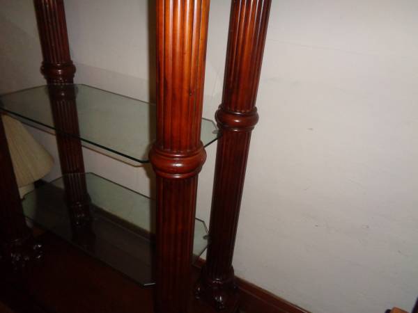 Perfect to display those special collectibles> I am downsizing and must part with my favorite piece of furniture>It is a mahogany 3 shelf plus base shelf display "cabinet " but open with its column structure> it is heavily carved on the top, sides and bottom>solid mahogany>it features 4 columns that create the "cabinet">the 3 tempered glass shelves measure 28" wide x 13"deep and the base also provides room for display> the structure is 79 1/2" high x 36" wide> it is truly a piece of quality and exceptional in its presentation> a magnificent piece for that special wall or entryway