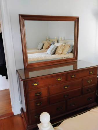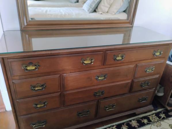 Jamestown solid maple hardwood beautiful dresser with wood framed mirror. Mirror is 44 in x 33 in. Includes custom cut glass top. Excellent condition. No scratches, solid, heavy, like new. 20 in...