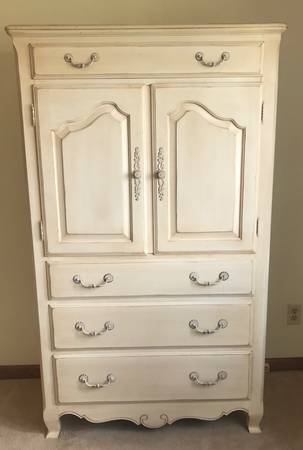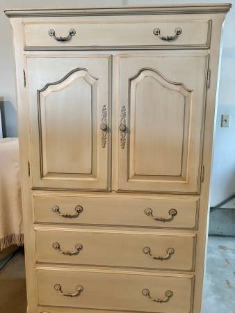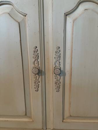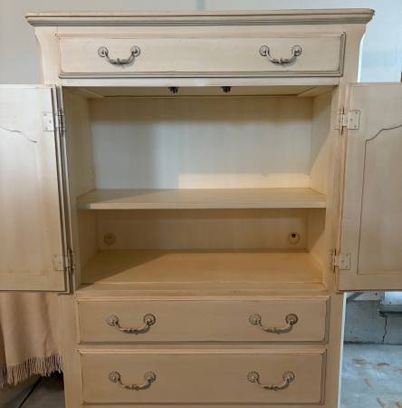 Ethan Allen 2 door dresser with one adjustable shelf, two wire hole grommets for tv cord and four drawers. The stain color is brittany and has a distressed finish. This was originally purchased for $2400.00 and is in brand new condition. Only used in a guest bedroom.