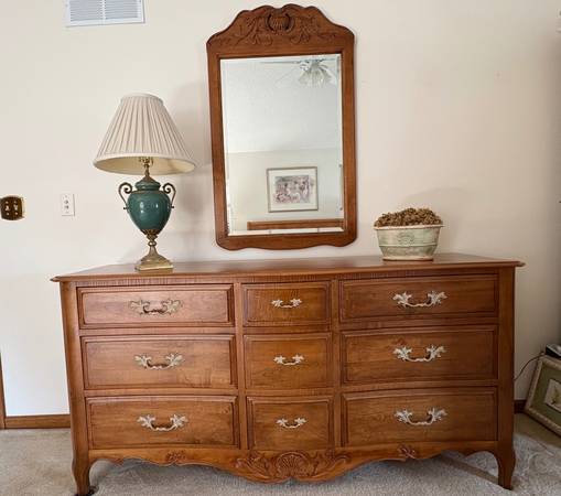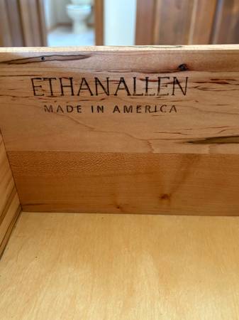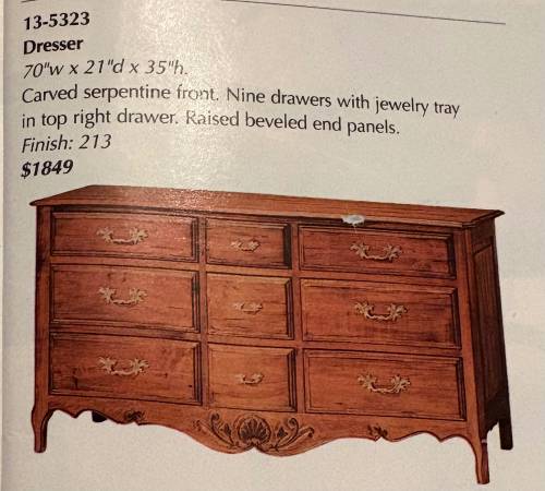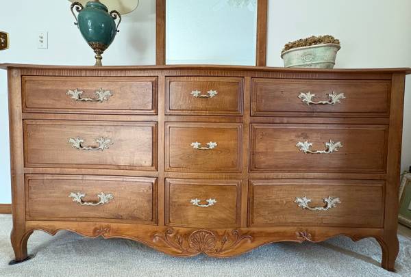Ethan Allen Legacy collection 9 drawer dresser in the color Russet. Top drawer has a jewelry tray. It is in excellent condition. Has a carved serpentine front and raised end panels. Primarily made of maple and select hardwoods. This is coming from a smoke free and pet free home.