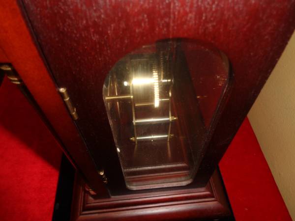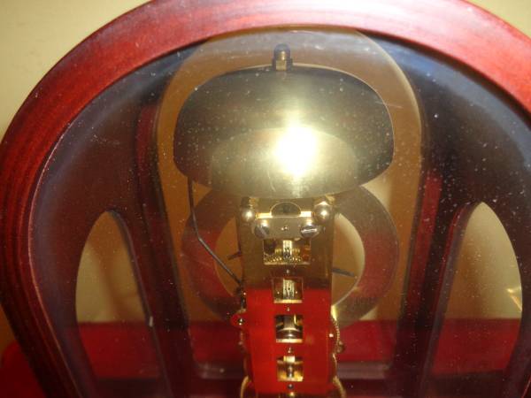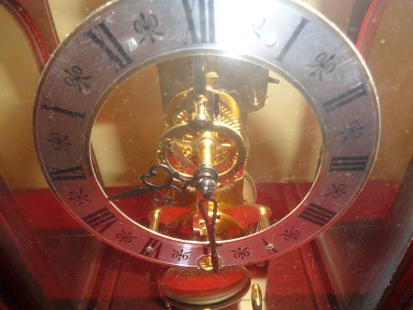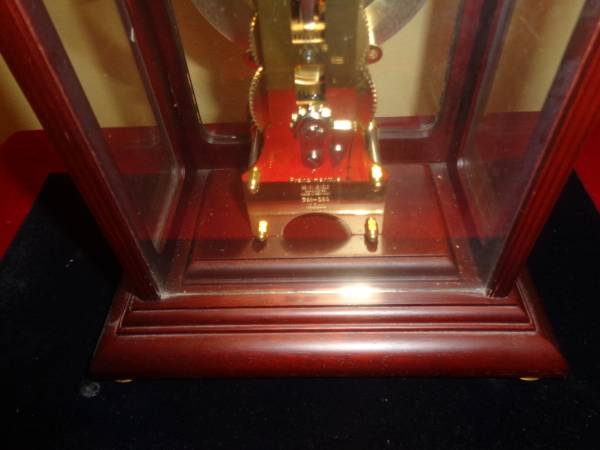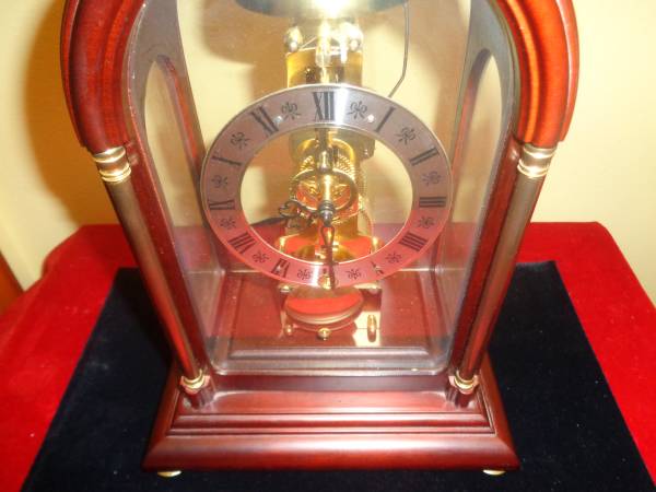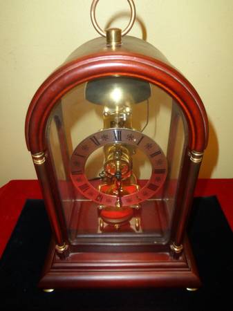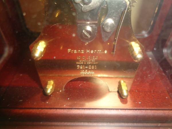 I am now disposing of my father's clock collection> this is an immaculate Franz Hermie shelf clock with skeleton movement> the bottom back panel has the authenticity inscribed >; it was made in Germany > has 4 glass panels and a mahogany case > it is a 14 day reserve with a silver round "chapter" ring > measures 12"x8" x6"> #791- 081> I believe it needs a key which I do not have> otherwise the clock is in excellent working condition with absolutely no scratches or wear> a beautiful time piece for a shelf or mantle