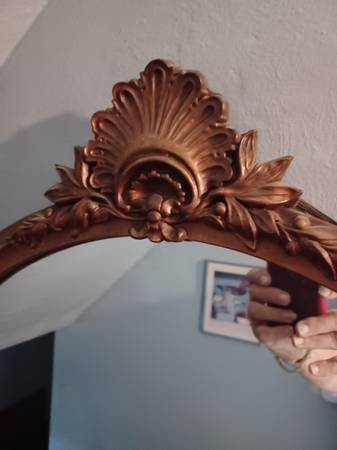 I am cleaning out my mother's house and this mirror hung in the entrance way for decades> it is truly a vintage piece with its gold gilt coloring on the wooden frame > there is a large scroll decoration at the top and and scroll decoration along the bottom > great condition for its age > measures 26" wide and long with 3.5" added with the top scroll