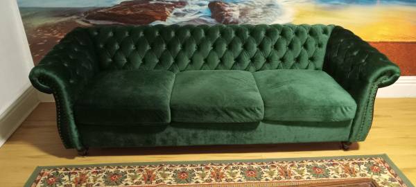Velvet 82-inch chesterfield green sofa looks brand new ORIGINAL PRICE $699.00 PLUS TAX FOR SALE ...........$189.00