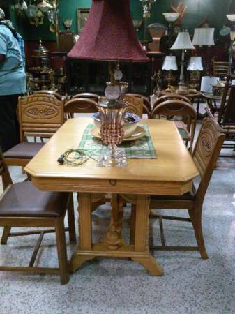 Solid oak table with built in extension 4 chairs with new upholstery Vintage L 45” Extension 14” W 33” H 29.5”