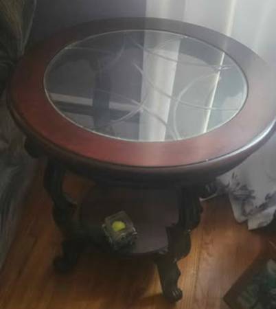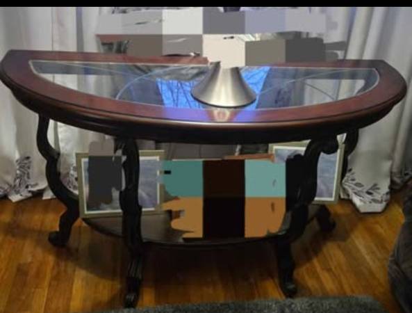 From Raymour & Flanigan. Mahogany/cherry color. Solid tables. Sofa table has a few service scratches . Price is for both. Sofa table is 24 in round by 24 in x H. Sofa table is 48 in W x 19 in...
