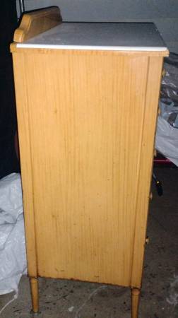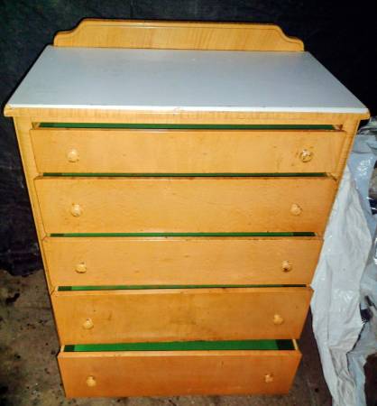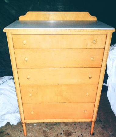 Simmons Steel Dresser 1930s War Time Folded Metal Wheat Wood ,Wood Grain Bell Geddes , It has a painted woodgrain surface every drawer lined with green felt , the drawer work great , its missing one of its coasters/wheels