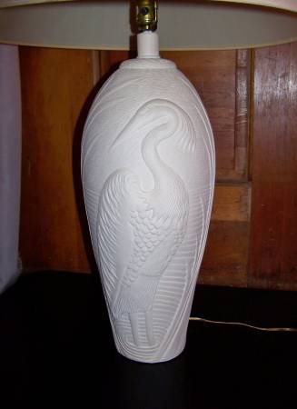 Vintage Dayle Rushall signed Heron / Egret white pottery table lamp with a 3-way socket from Pacific Coast Lighting. Has a bird motif on both the front and back. There are a few chips here and there and the shade might need a cleaning but otherwise in great shape. Overall approx. 36" tall and the shade is approx. 23" wide. Asking $40 or best offer. 44O-45twoO