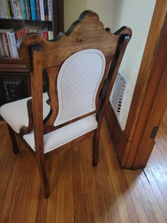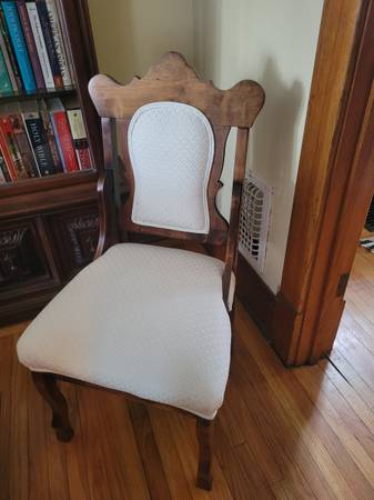 This vintage decorated side chair makes it a great piece for any room in the house. It has a very comfortable Ivory cushion with Cherry stain wood finished. $75. or B/O