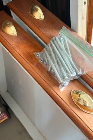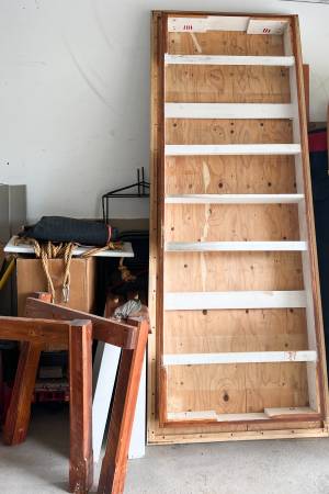 White Formica work table with two drawers. Currently disassembled in our garage. Large white work surface with two drawers, leg brackets and hardware. Very heavy