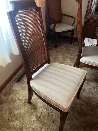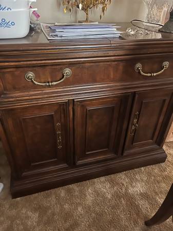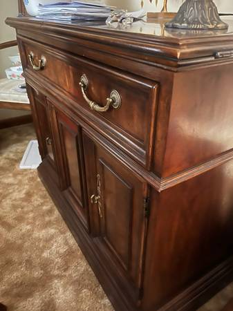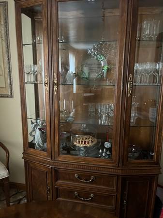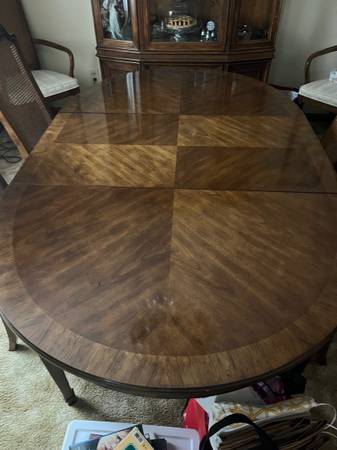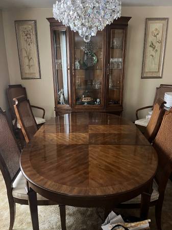 This is a mahogany extension dining table with a sunburst pattern inlay and a pedestal base, manufactured by Drexel Heritage. All three pieces included in price. China cabinet and hutch . Depew area...