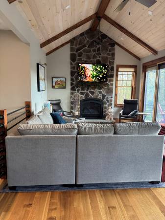 Ethan Allen "Bennett" track arm sectional couch with Grade E fabric in Fog Gil, comfort cushions and tapered leg in Bark Brown. The corner piece is 37" x 37" x 37" and the two side sections are each 51"x 37"x 37". Total length assembled is 88" each way. Couch was purchased in 2021. Regular price was $8,003 and we purchased during the annual sale for $6,402. The couch is in exceptional condition. It's located in a vacation home in Ellicottville, NY and has seen limited use. Non Smoking household. Pillows not included. Original receipt is available.