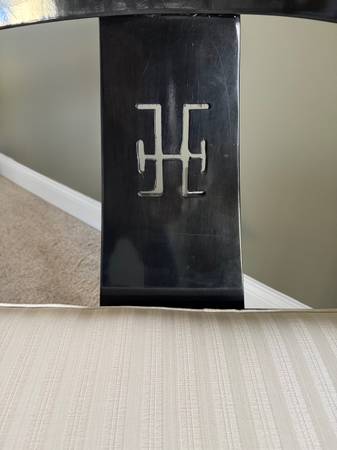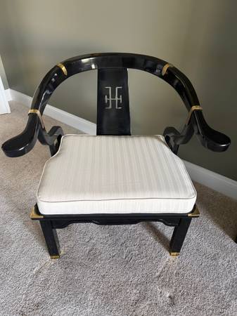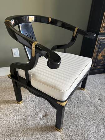 Two chairs are included—black lacquer with light fabric seat in perfect condition.