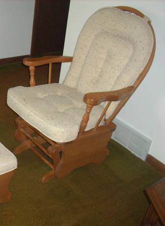 Glider rocker chair. Solid oak wood framework and upholstered back and seat cushions. Excellent/like-new condition.