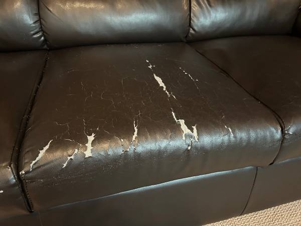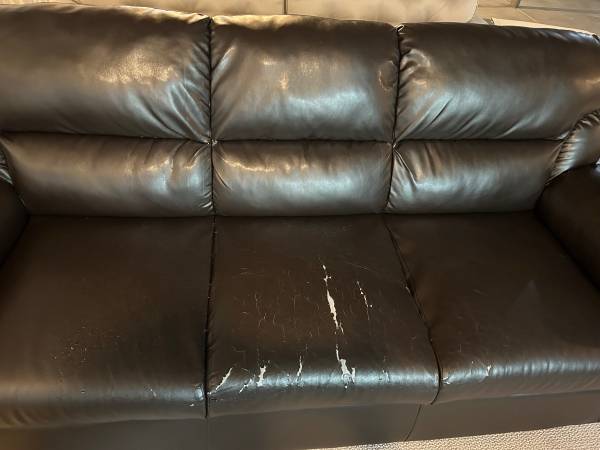 Brown faux leather couch. Some wear on seat cushions. Smoke free home. 6.5 ft long, 3 ft deep