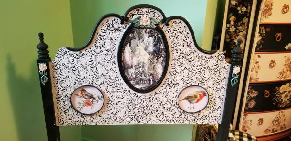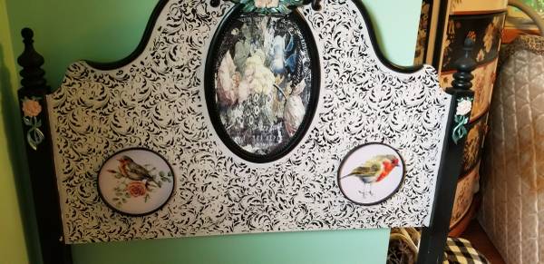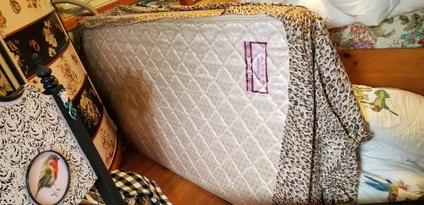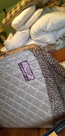 Pictures include a long shot of the headboard, a closeup of the headboard, a closeup of the inside footboard, the outside footboard, the frame itself, and pictures of a Restonic mattress, which has a stain shown on the left in the last picture. Restonic mattress is less than 10 years old, barely used (not sure where the stain came from). Also have an old boxspring, which is just for height, so there is no gap between the mattress and headboard footboard. $50.00 will be taken off if mattresses are not needed. Dimensions: 48 inches tall at headboard, 40.5 inches wide, and 79 inches long. Bed can be broken down, and is in Lewiston, NY. Wonderful Christmas Gift! One of a Kind! Have to see it to appreciate it!