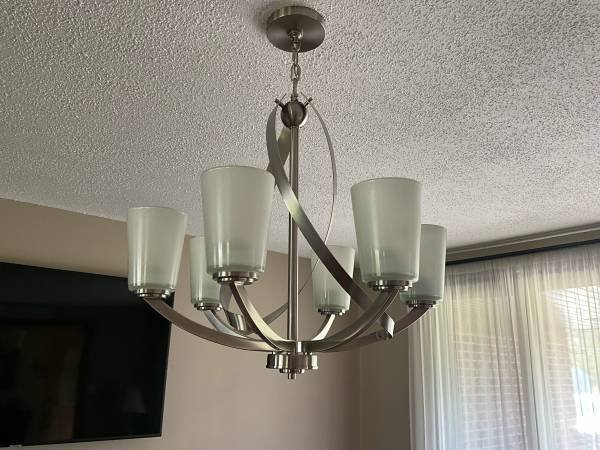 Beautiful brush nickel ceiling light only 1 year old bought at lowes and it is still in the store for $229.00 I am asking 100.00 firm. It is still hanging in my dining room room so you can see it up only reason I’m selling it because I’m making my dining room into a family room. Comes from a very clean,smoke pet free home. Your gain my lost. Call show contact info