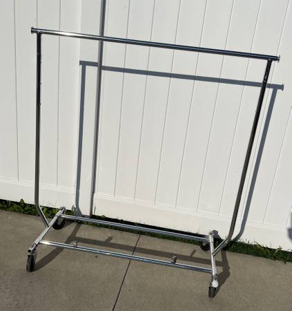 Good Quality Clothing Rack with wheels, and side extenders. Folds down nice for storage $45.00 Call or Text Only No EMAILS