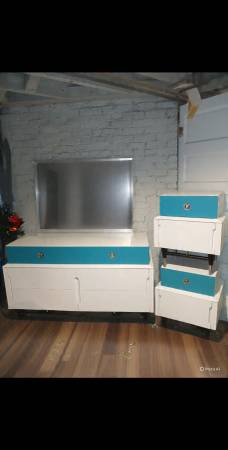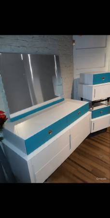 Completely revamped into a modern style these solid wood pieces are amazing. The 6 dovetailed drawer dresser measures 54 inches long x 19.5 inches deep and 31.5 inches tall. Each nightstands has 2 dovetailed drawers and measures 20 inches wide x 16 inches deep and 24.5 inches tall. The frame-less mirror measures 40 inches wide x 29.5 inches tall. The set in painted a bright white and sealed in a matte finish. The accent drawers are a lovely coastal blue and could easily be changed to any other color desired. The legs are painted black and the hardware is stainless steel. Available for pickup in North Tonawanda.