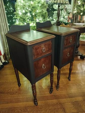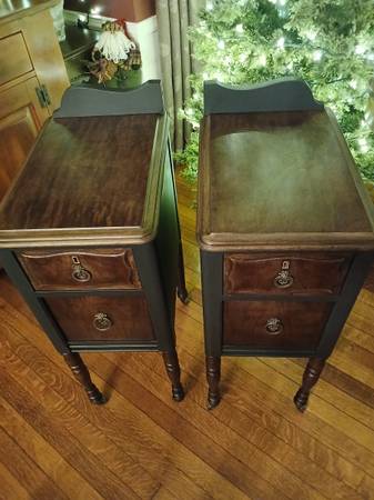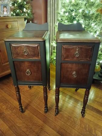 Separated from an antique vanity, these wooden pieces have been restyled with walnut stain, poly and Fusion Ash color paint. Tops and drawers are burled walnut and have been sanded and stained walnut as well as the legs. Balance has been painted. Each measures 13 inches wide x 18 inches deep and 32 inches tall not including back pieces. There are wheels on the bottom of each legs and they roll well. Available for pickup in North Tonawanda.