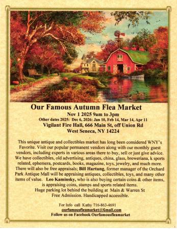 Our unique antique and collectibles market has long been considered WNY’s Favorite and has been running for many years. Visit our popular permanent vendors along with our monthly guest vendors, including experts in various areas there to buy, sell or just give advice. We have collectibles, old advertising, antiques, china, glass, breweriana, knickknacks, sports items, ephemera, postcards, books, magazines, toys, jewelry, tools, household items, clothing, crafts, and much more. We are happy to announce that Mr. Bill Hartung, former manager of the Orchard Park Antique Mall & Lancaster Emporium, will be here offering free appraisals of antiques and collectibles. There will also be free appraisals of coins, stamps and jewelry by Leo Kaminsky, who is also buying coins. Free Admission. Handicapped accessible. Ten Lives will be here selling items and accepting donations to help them to continue to bring healthy cats into happy homes. The Vigilant Bistro will have breakfast and lunch available. Huge parking lot behind the building at Main & Warren St