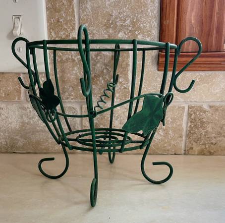 Decorative metal. 6” tall. 5 1/2” diameter at top. 3 1/2” diameter at bottom. Ivy design on the front. Will hold 4” or 6” pot. Excellent condition. (Flower pot and plant not included.)
