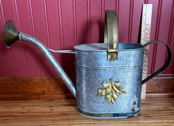 7 3/4” high, plus the handle which is another 4”. Holds about a gallon, although this has never been used for liquid, only used for decoration, with dried flowers, etc, in it. It’s about 18” from edge of handle to edge of spout. A little surface rust.