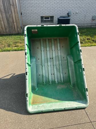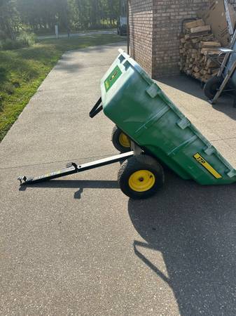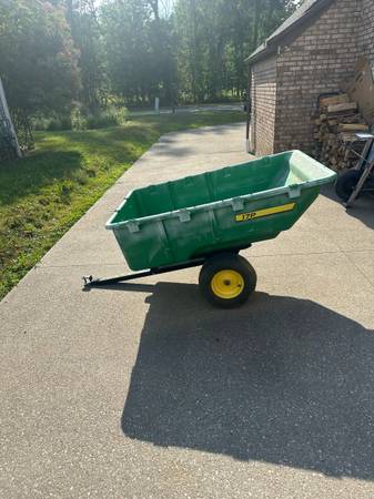 Large John Deere Dump Cart Biggest load capacity available Can hold 1000 lb loads Step on foot lever to dump Hooks up to Tractor, riding mower, ATV etc.