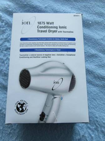This is a brand new dual voltage hand held travel dryer. Emits negative ions, nourishes hair from the inside out maintaining the hair's natural moisture and natural balance. Taken out of box only for picture, it has never been used. Brand new.