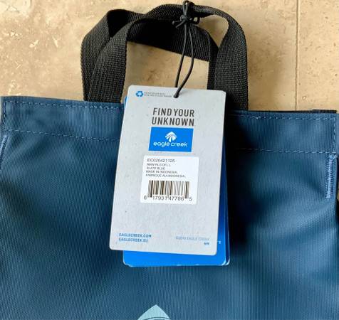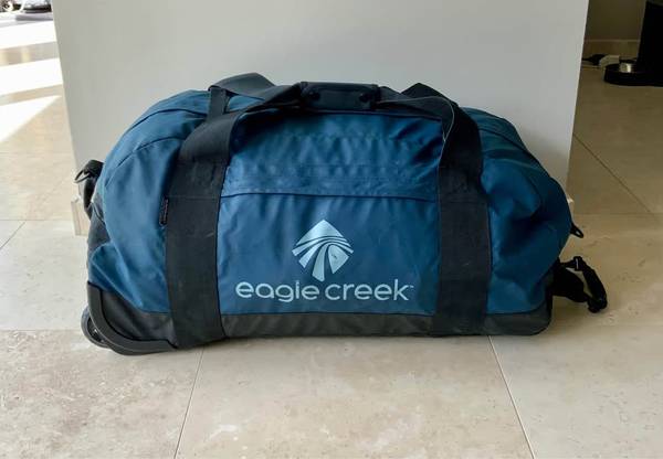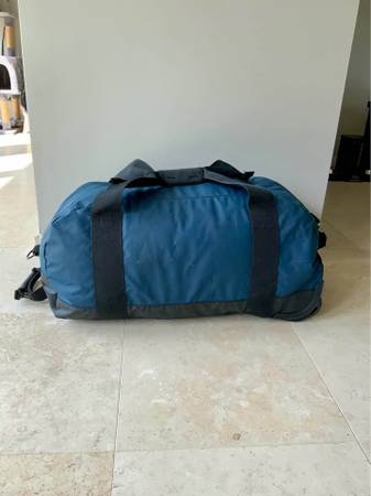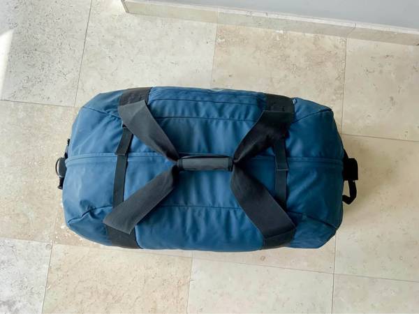 Reusable "stuff pouch" stores this duffel bag and works as an internal packing accessory for shoes or gear