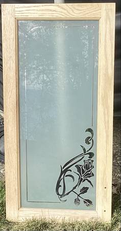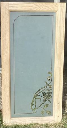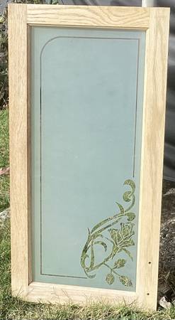 This Mirror insert has a sandblasted background with a beautiful Rose design. The Mirror insert is attached to a hardwood door with clips. The Cabinet Door size is 27" long x 14" wide. The Mirror...