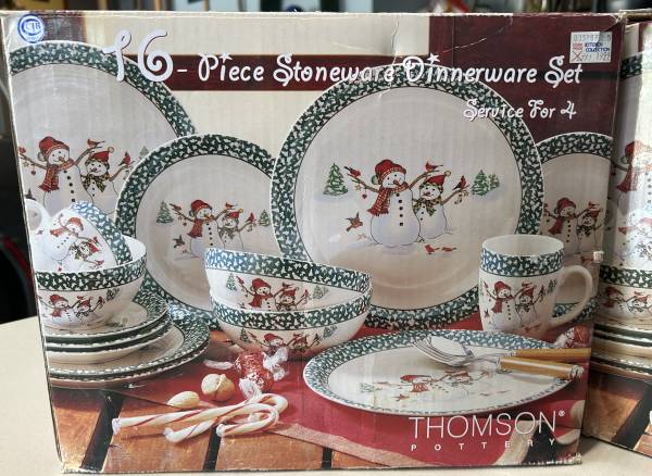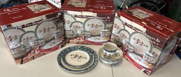 WINTER HOLIDAY STONEDWEAR Service for 12 Larges plates are 10 inches, Small plates 7.5 inches and Bowls are 6 inches Microwave and Dishwasher Safe. One dessert plate is missing. A BARGAIN at $35.00