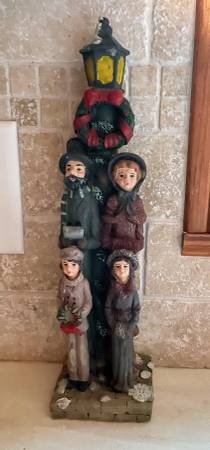 Nine Christmas Carolers (one is a snowman). Excellent, like new condition. The lamp post is about 12” tall. There’s also a little fence that you can put around them, and then toss in some fake snow flakes around them. Looks really cute on a mantle or on the piano.