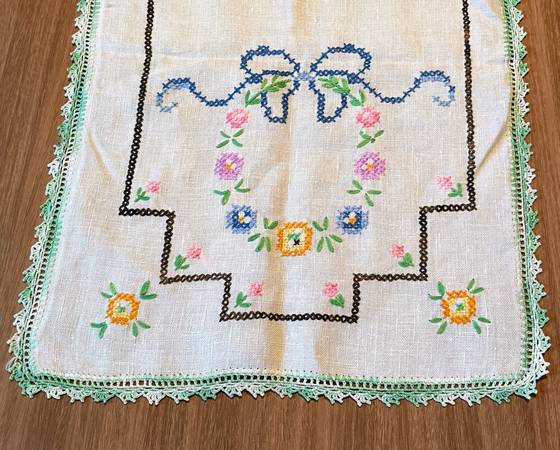 Hand embroidered with crochet edging. 13” x 39”. Beautiful. Very good condition.