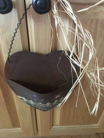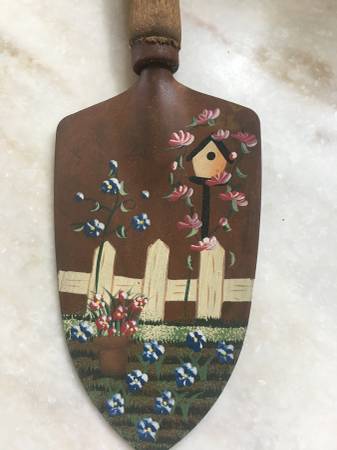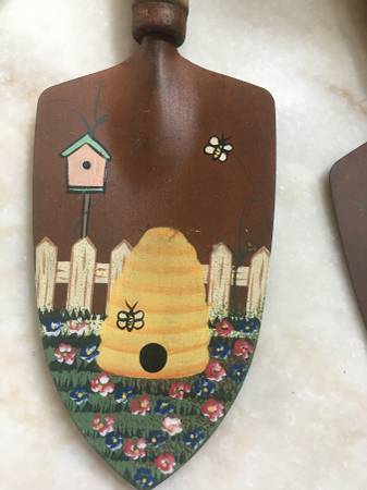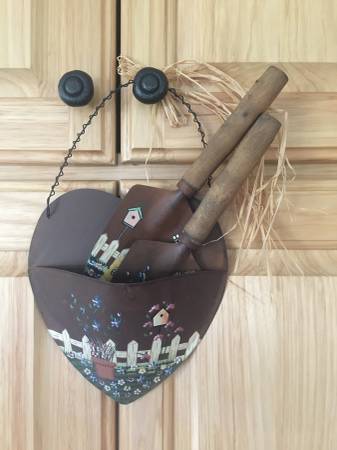 The heart-shaped hanger is 12” high including the wire hanger. The shovels are 10 1/2” long, and they have a little hole in the handle that goes right through, so you can put a wire through there to hang them up.