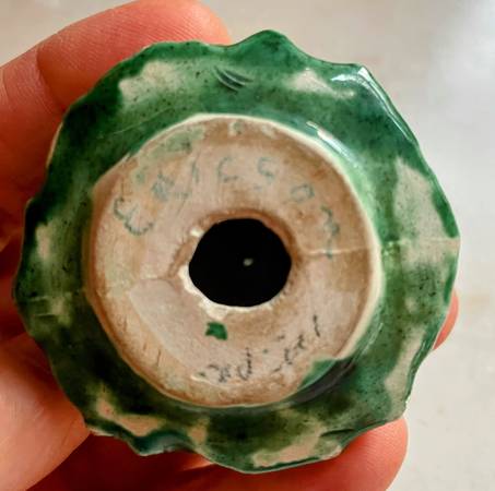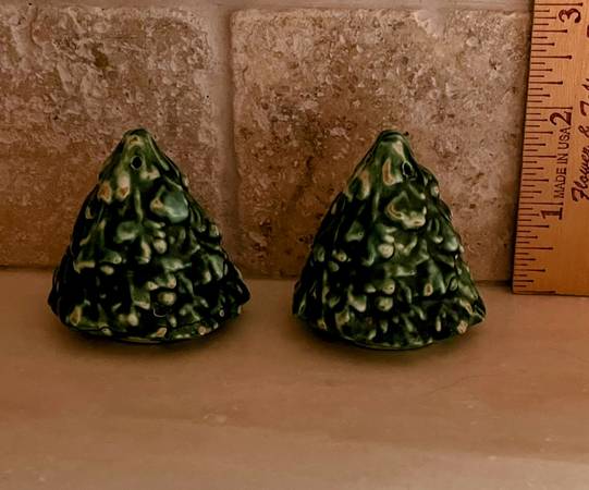 Ceramic Christmas Trees Salt and Pepper Shakers. Handmade by “Ericson” (I don’t know who that is, that name is written on the bottom). About 2” tall, one has 3 holes at the top, one has 4. You will need little corks for the bottoms if you want to use them, or just display them on your Christmas decorated mantle.