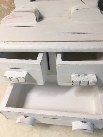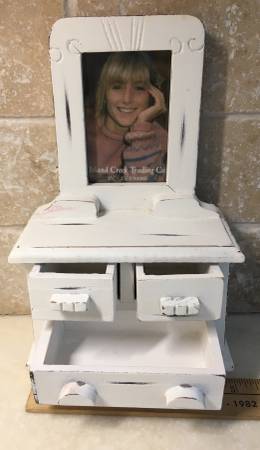 Three drawers. The picture frame holds 3.5” x 2.5”.