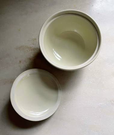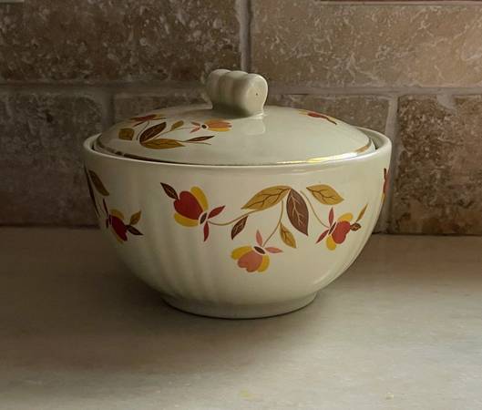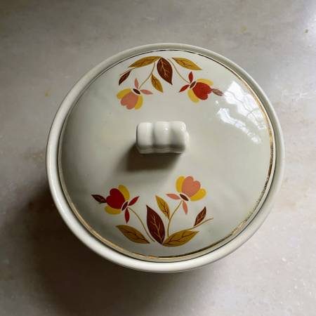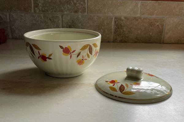 This bowl was designed for the stove top and was used for bacon grease / fat. 5” diameter around the top, about 3 1/2” tall to the top of lid. Tootsie Roll handle on lid. No cracks or chips. The gold line around lid is faded a bit. Very good condition.
