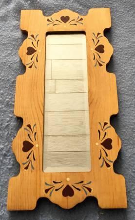 Wood framed beveled glass wall mirror, hand painted Pennsylvania Dutch hearts and flowers. Measures 16 1/4" x 8 1/4". The wood is a natural finish, the design is a heart and flower stencil design in shades of blue and burgundy. Has hangers on the back side so it can be hung horizontally or vertically. A pretty decorative accent piece for the country or farmhouse home.