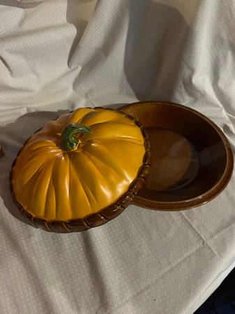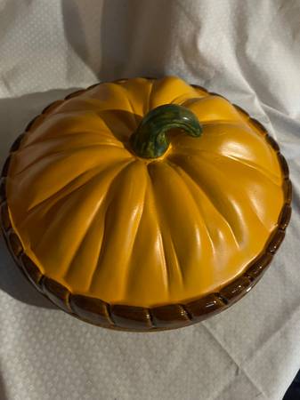 Vintage "Pie-Keeps" Pumpkin-Shaped Ceramic Plate and Cover 11" diameter; 5" high with cover Comes in original box Made in Portugal Perfect condition! Pick up for only $35! (Cash only, please)