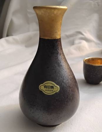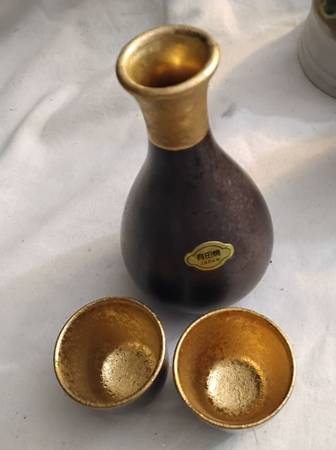 Pre-owned, used once, small tokkuri Sake server with 2 cups and gold lining. Server measures 4.5"×2.5", cups measure 1.5"×1.5". NOT dishwasher safe. Gently hand wash. See pictures.