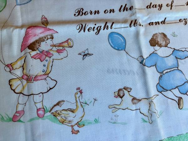 New stock from 1960’s era Birth record embroidery design features a pillow pattern. Colorful printed pattern on both sides. Easy to customize with names and dates Whimsical graphics. Finished pillow...
